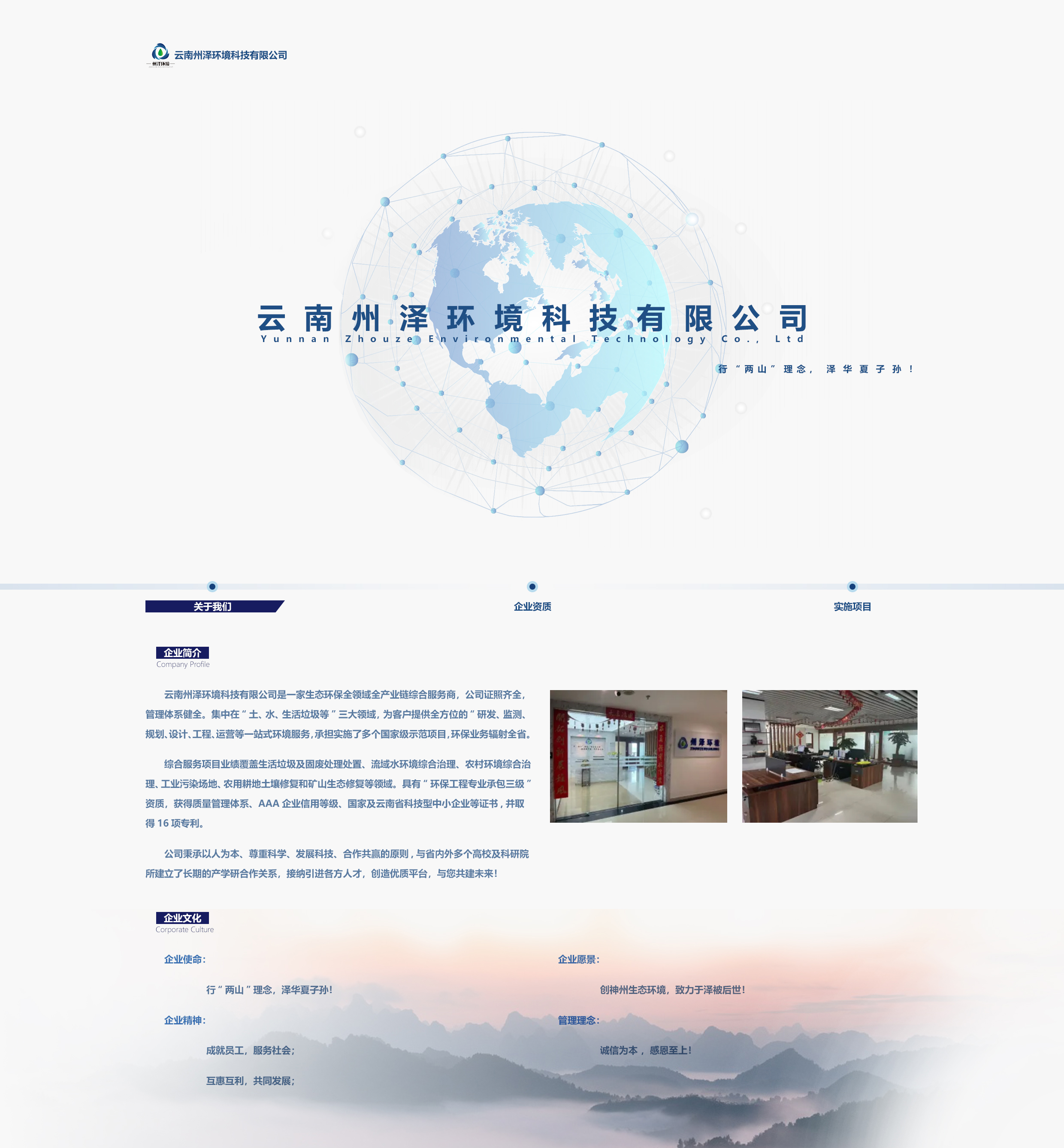 綜合服務(wù)項(xiàng)目業(yè)績(jī)覆蓋生活垃圾及固廢處理處置、流域水環(huán)境綜合治理、農(nóng)村環(huán)境綜合治理、工業(yè)污染場(chǎng)地、農(nóng)用耕地土壤修復(fù)和礦山生態(tài)修復(fù)等領(lǐng)域。具有“環(huán)保工程專(zhuān)業(yè)承包三級(jí)”資質(zhì),獲得質(zhì)量管理體系、AAA企業(yè)信用等級(jí)、國(guó)家及云南省科技型中小企業(yè)等證書(shū),并取得16項(xiàng)專(zhuān)利。
